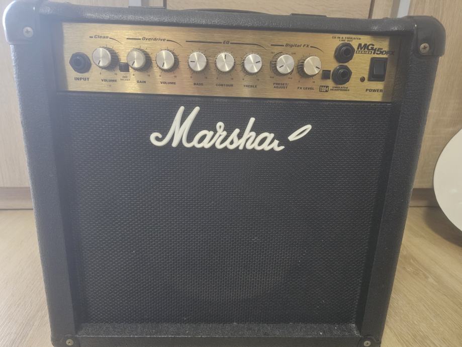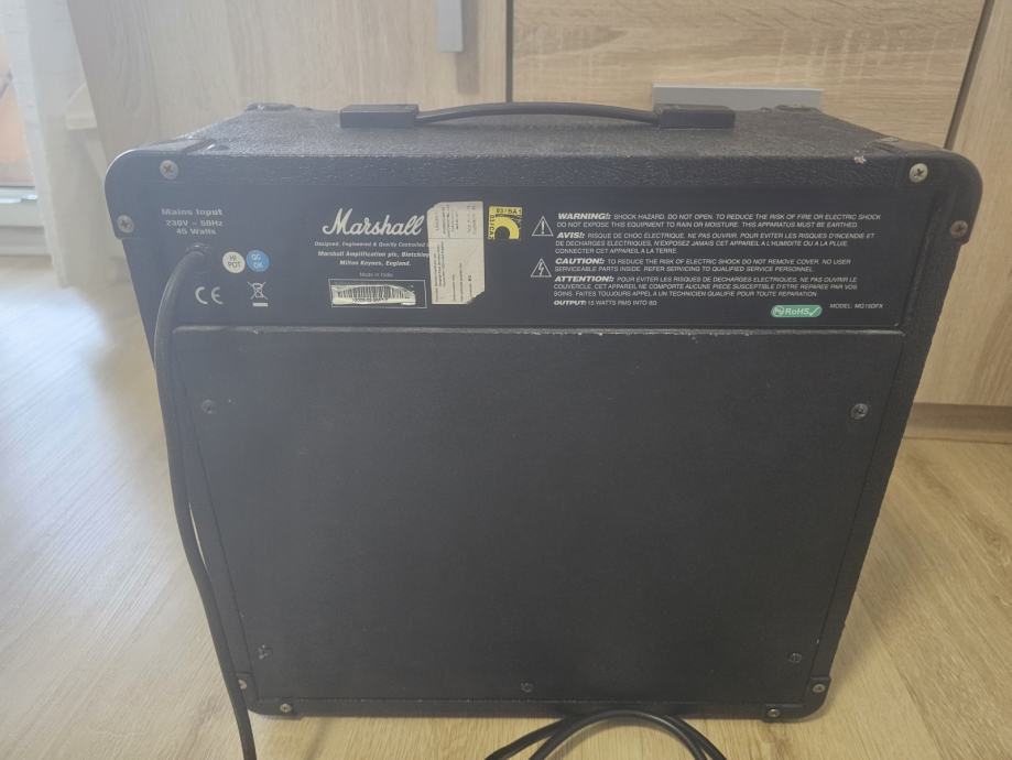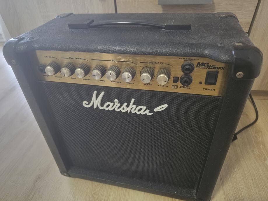 Marshall amplifier, MG Model 15DFX Series. MG of 2nd generation. Category: solid state guitar combo amplifiers. With digital effects (Reverb/Delay/Chorus/Flanger). Power: 15W (in 8 ohms). Number of channels: 2. Clean channel: volume