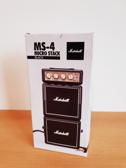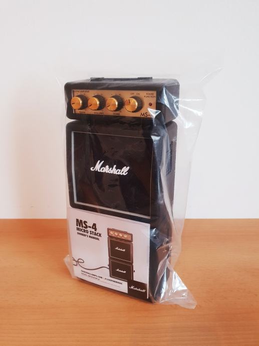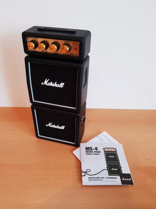 Prodajem Marshall MS-4 Micro Stack - mini pojačalo, output: 1W. Sadrži Gain, Volume, Tone knobove. Također ima ulaz za slušalice.