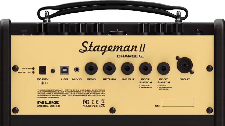 NUX AC-80 STAGEMAN II pojačalo za akustičnu gitaru sadrži 2 odvojena kanala, i oba su optimizirana za akustičnu gitaru ili mikrofon. Dva kanala na NUX Stageman II pojačalu pružaju Vam još više mogućnosti za nastupe ili studijski rad. Opremljen najnovijom NUX DSP tehnologijom, Stageman II daje jasan, bogat akustični ton s izvrsnom projekcijom zvuka koja daleko nadmašuje njegovu veličinu. XLR DI izlaz i Line izlaz mogu se koristiti kao analogni audio izlaz za snimanje ili slanje signala na monitor ili ozvučenje. Ako želite spojiti vanjski efekt, s kojim možete dodatno poboljšati i obogatiti svoj zvuk, Stageman II sadrži i Send/Return FX Loop ulaz.