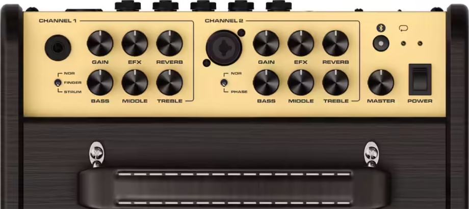 Kontrole: 2x Gain, 2x EFX, 2x Reverb, 2x Bass, 2x Middle, 2x Treble, Master; Switches: EQs (Nor/Finger/Strum),