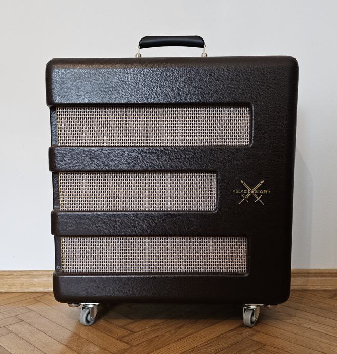With 13 watts of 6V6 power and a 15" Special Design speaker, the Excelsior sports a brown textured vinyl covering, an unusual E-shaped grille design