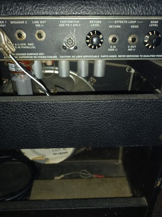 cijevno pojačalo, odlično,55 Watti, 2x6L6, 5 lampi u preampu, "Fender na steroidima", dva kanala, Fenderov clean, Marshallov drive,,efekt loop, switch pedale (originalna i dodatna, manja sa svim funkcijama), cover stari ali štiti...