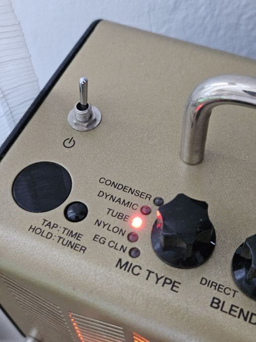 – Kontrole: MIC TYPE, BLEND/GAIN, TONE, EFFECT, DLY/REV, VOLUME, TAP/TUNER