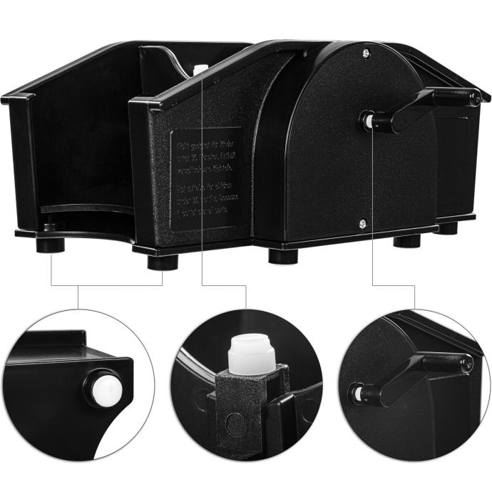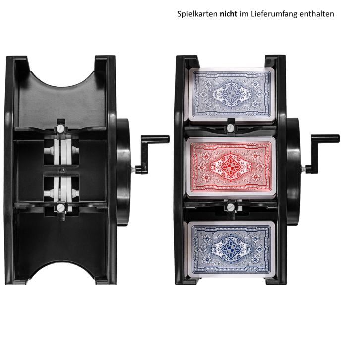 S mehaničkim mješačem karata iz GAMES PLANET-a karte dimenzija 80-91 cm x 55-65 cm lako se savršeno miješaju. Zahvaljujući ručnoj kurbli stroja za miješanje karata, nisu potrebne baterije! Odstojnici se mogu podesiti pomoću bijelih vijaka za podešavanje, tako da je uvijek zajamčen savršen proces miješanja.