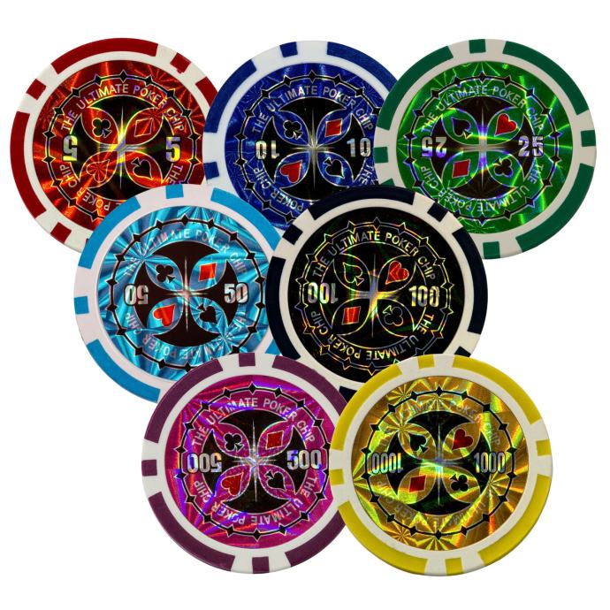 600 Laser-Chips mit Hologrammeffekt, Gewicht eines Chips: ca. 12 g (Professioneller Pokerchip mit Metallkern), Chip-Maße: Ø 40 x H 4 mm