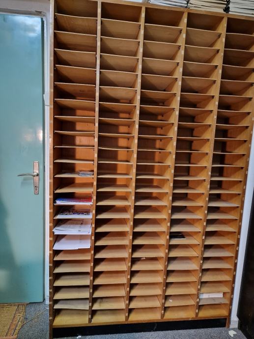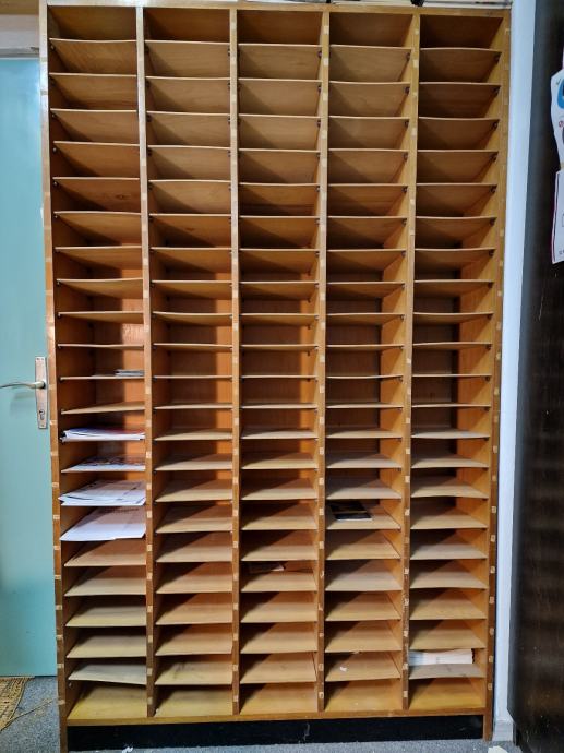 Drvena polica, visina 200 cm, širina 122 cm, dubina 30 cmm, 110 (5×22) pretinaca A4 formata, za odlaganje prospekata, pošte i sl., poklanjam.
