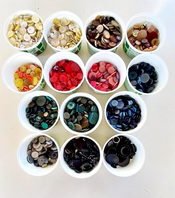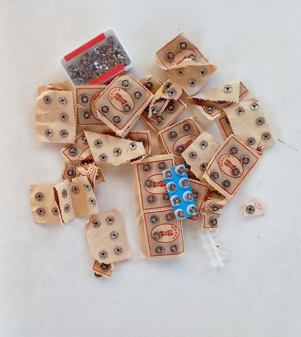 Gumbe u raznim bojama, rezervne gumbe u vrećicama (koji dolaze prišiveni na odjevni predmet) i metalne drukere, poklanjam.