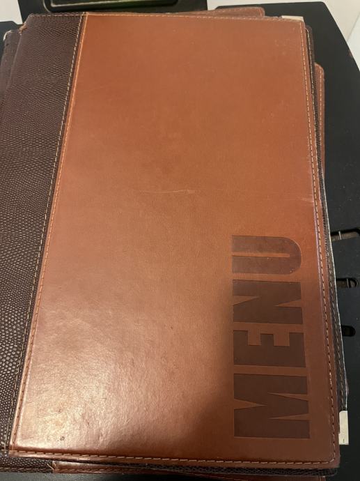 Poklanjam 6 komada korica za jelovnik / meni / menu za restoran. Korišteno, ali u ok stanju. Kupljeno u metrou.