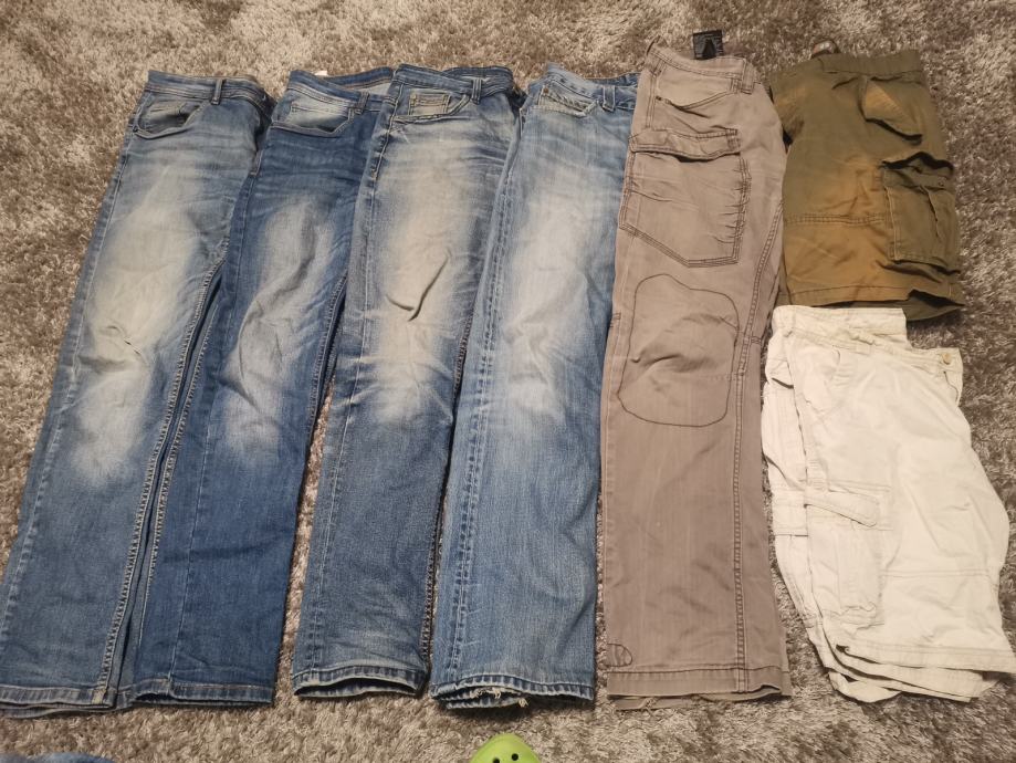 Odjeća je oštećena, hlače uglavnom puknute među nogama.. Može koristiti eventualno za neke poslove u građevini, na njivi, oko životinja...