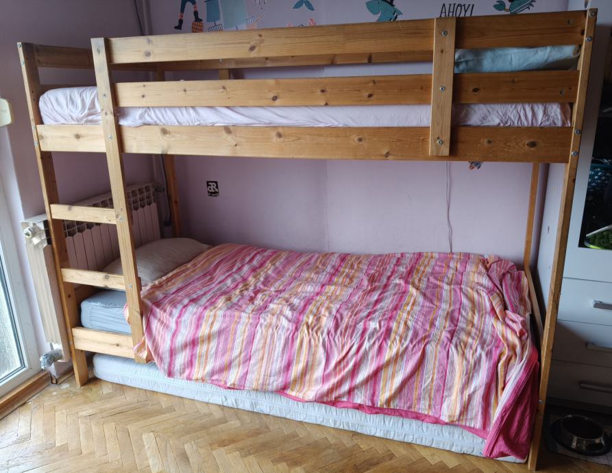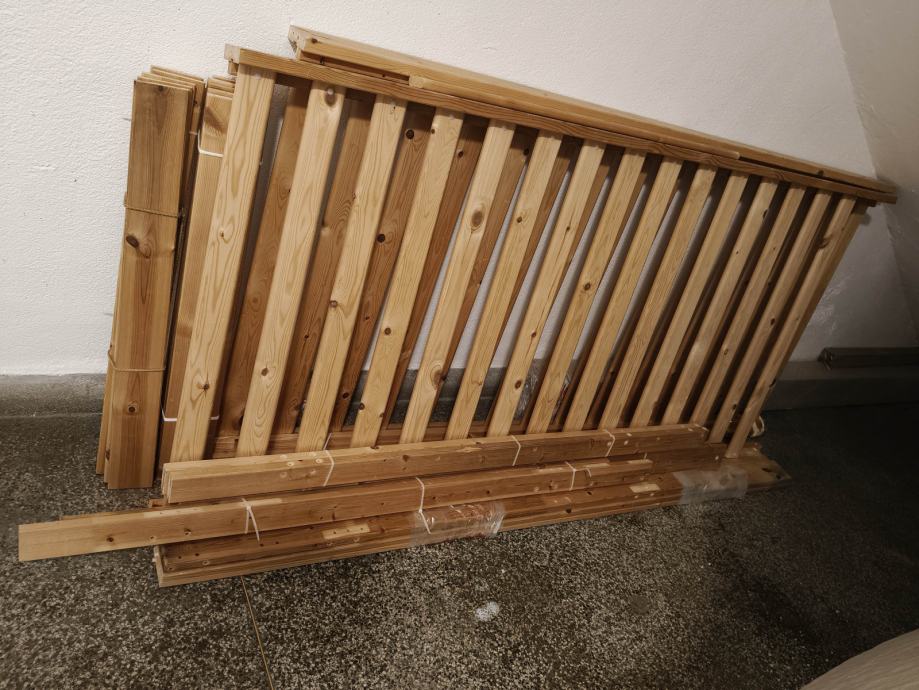 Rastavljen, podnice ostale složene. Postoji malo oštećenje, svi dijelovi na broju. Bez madraca.