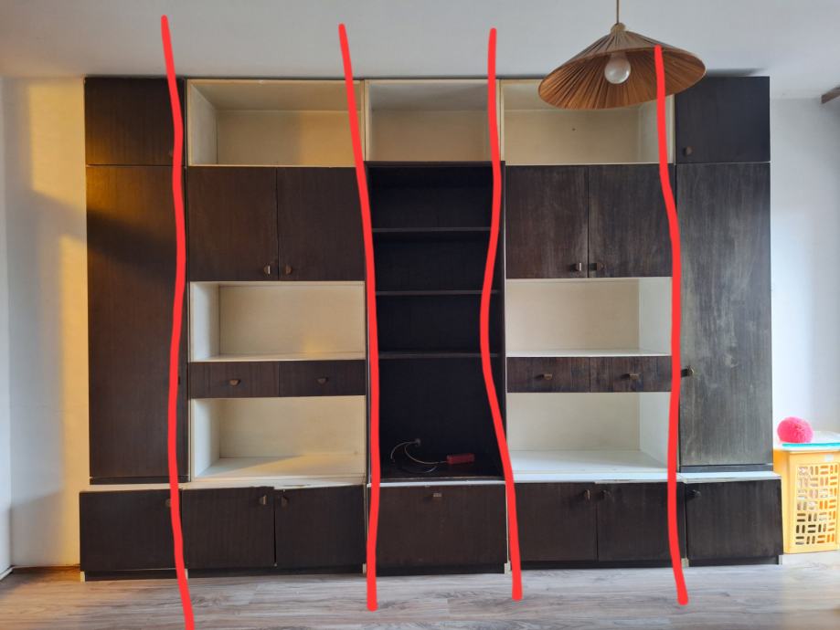 Svaka sekcija se može zasebno držati (nema čavala između njih te su sekcije označene crvenim linijama na slici), tako da nije potrebno puno montaže. Srednji ormar ima provod za kablove. Poželjno bi bilo što prije doći po njih. Hvala Vam!