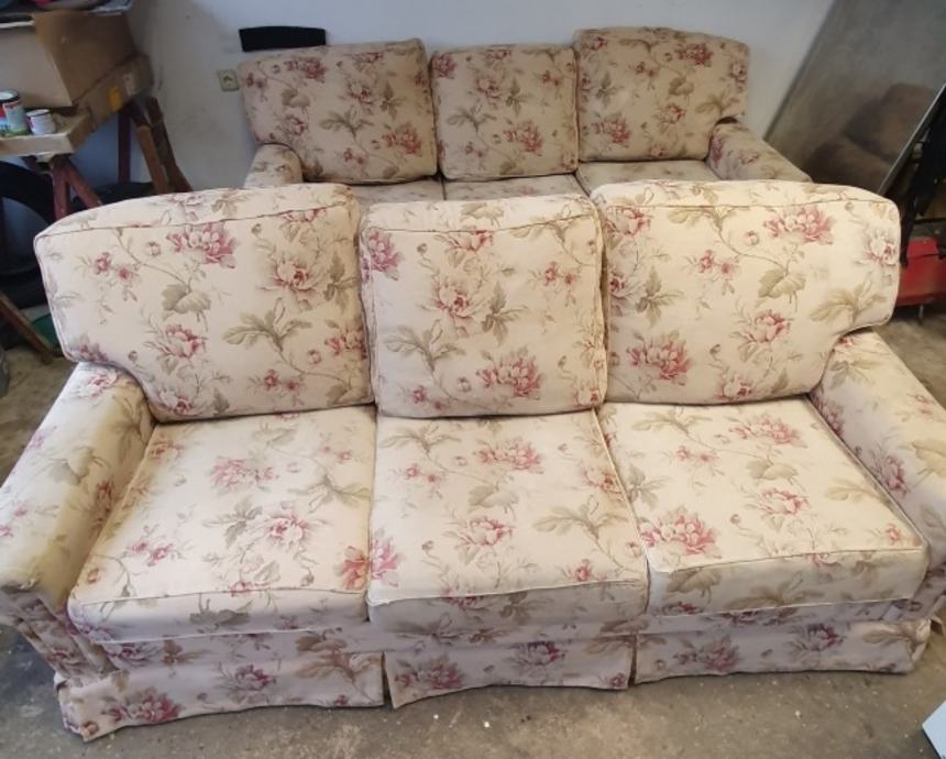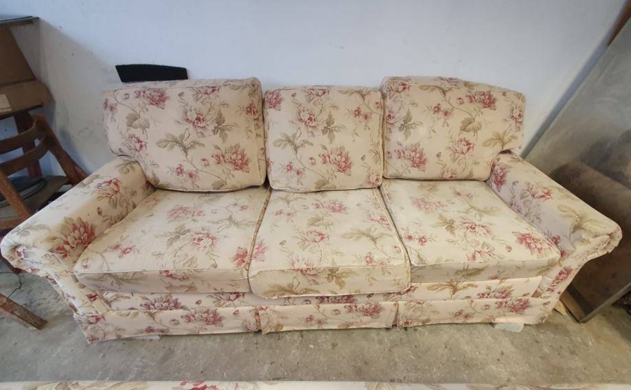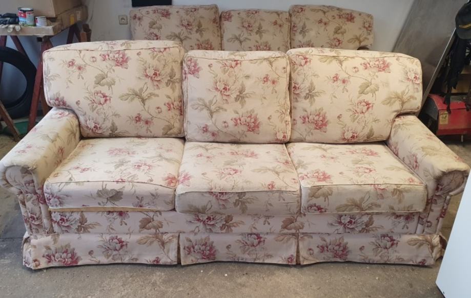 Poklanjam dva trosjeda dužine 220cm. Presvučeni su tkaninom s cvijetnim uzorkom u bež i ružičastim tonovima. Imaju tri velika jastuka za sjedenje i tri jastuka za naslon.