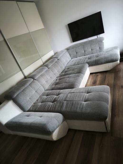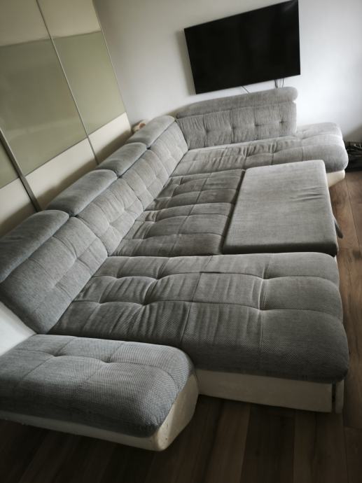 Velika garnitura sa slike, eko koža se pogulila, čvrsta je, ima ležaj.Dimenzije su 3m, a za ovo bočno nisam sigurna, mislim 1.7 i 1.8 m, jedan dio je malo duži od drugog.Ima naslone za glavu koji se mogu podignuti.
