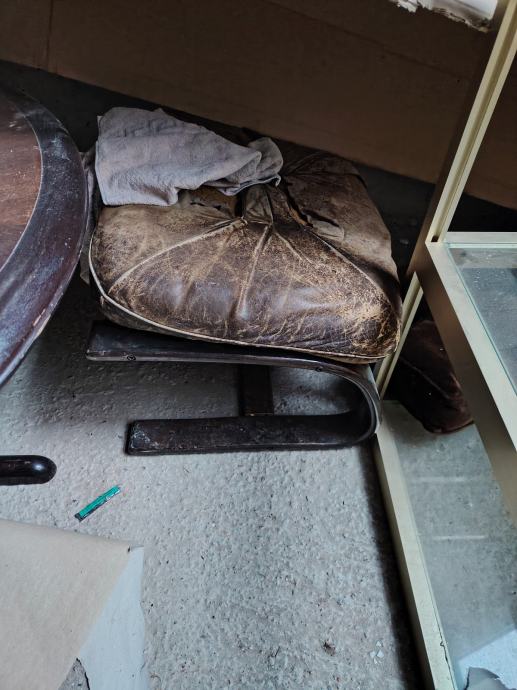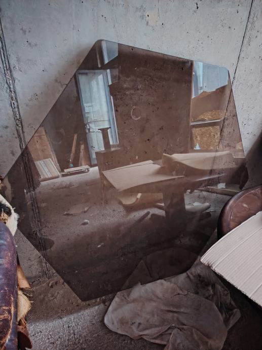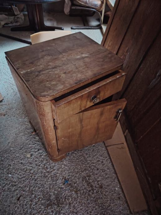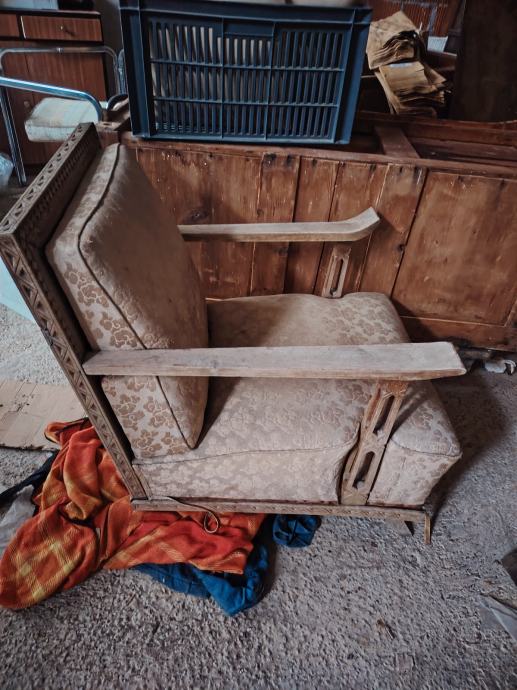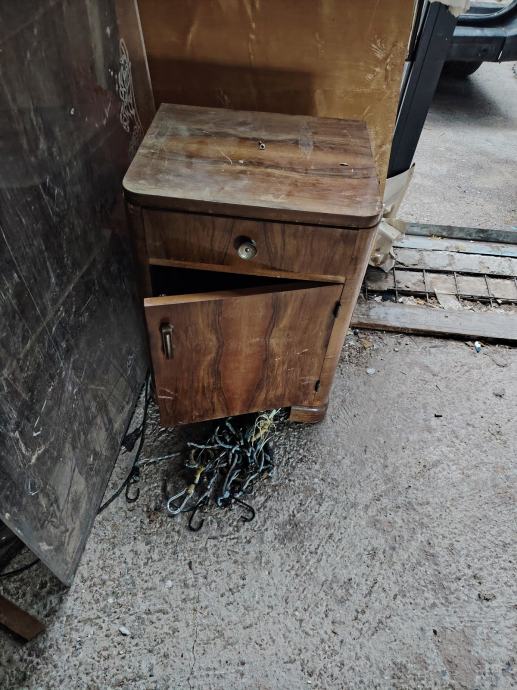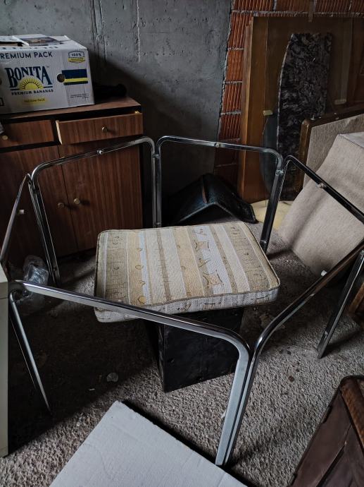 Kromirani stol, staklena ploča malo oštećena, 3 art deco fotelje, dva noćna ormarića, tabure