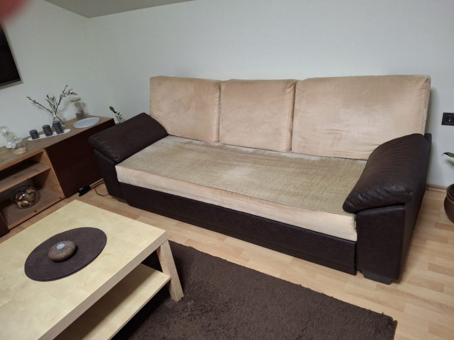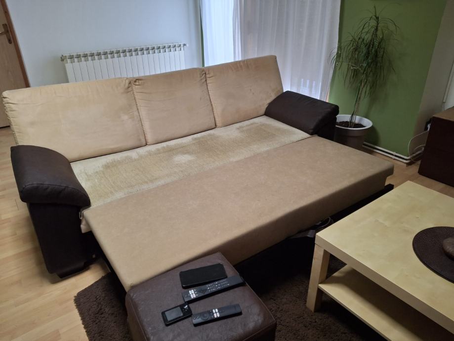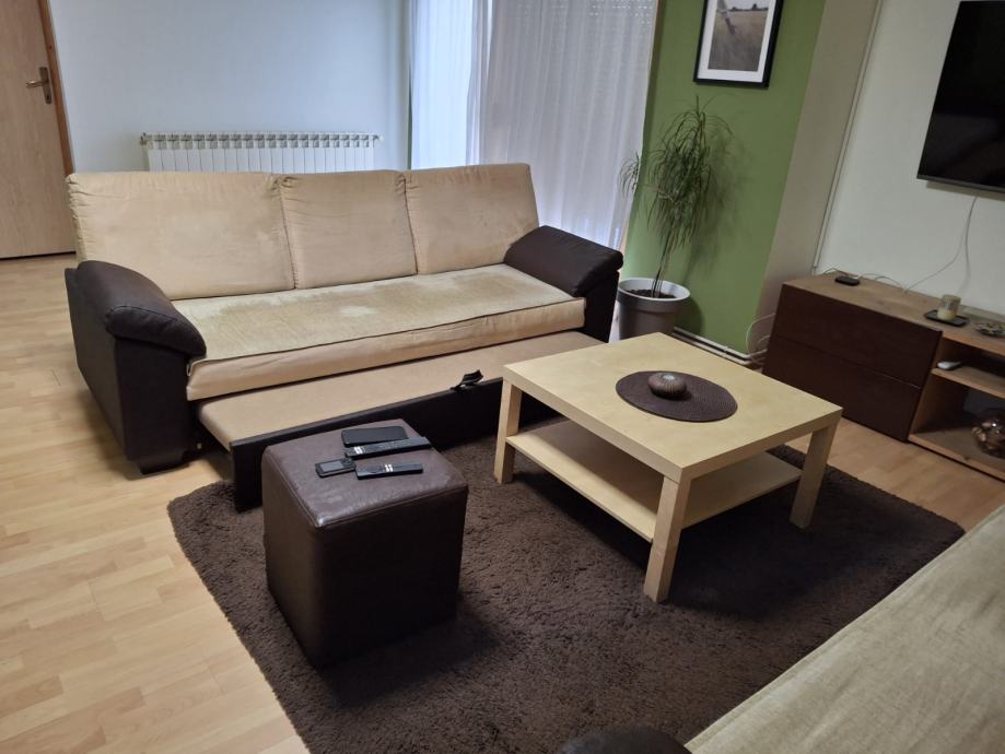 Dva trosjeda na razvlačenje, na jednom oštečena tkanina,tv komoda, stolić i tepih,poklanjam molim uzeti sve