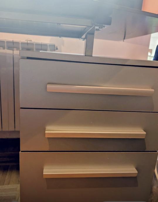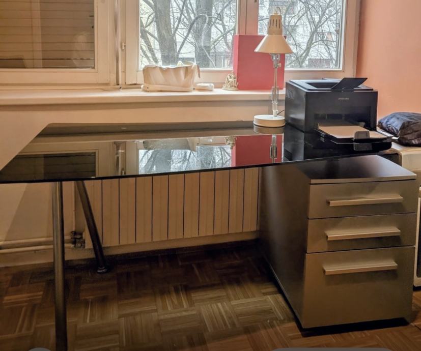 Poklanjam crni stakleni stol, dimenzije 150 cm x 80 cm, ladičar i stolac.