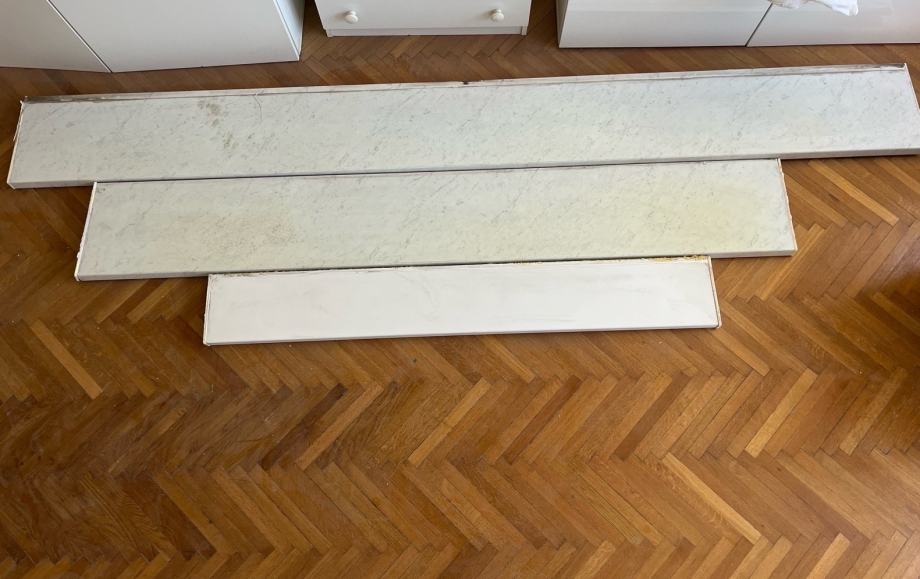 Poklanjam unutarnje PVC klupice u bijeloj boji s uzorkom koji imitira mramor. Radi se o tri klupice različitih duljina, pogodne za ugradnju u unutarnje prostore: 276 x 30, 207 x 30, 144 x 20. Preuzimanje osobno.