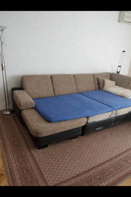 Poklanjamo veliki kauč na slovo U, kauč se može razvuči u ležaj i ima spremnik. Garnitura iako je stara tek par godina nije u idealnom stanju zbog umjetne kože koja se ljušti,a na zadnjoj slici je vidljivo oštečenje i tako je na svim mjestima koji su presvučeni u tu umjetnu kožu,dok je smeđe sjedište u super stanju. Kauč se nalazi u Splitu i postoji teretni lift u zgradi.
