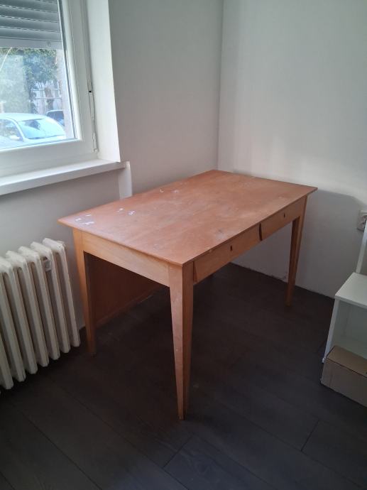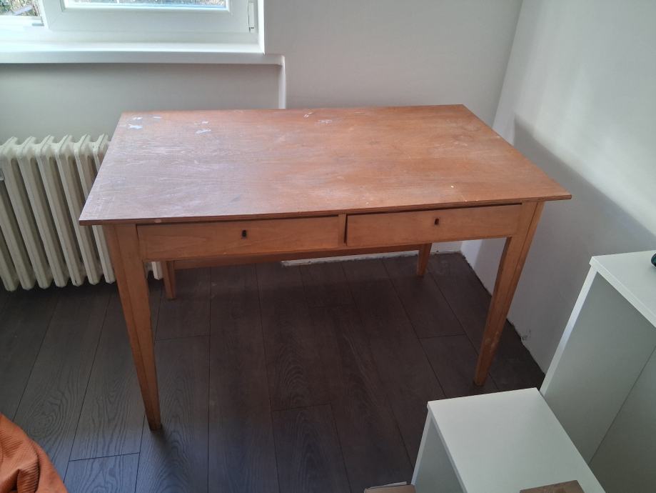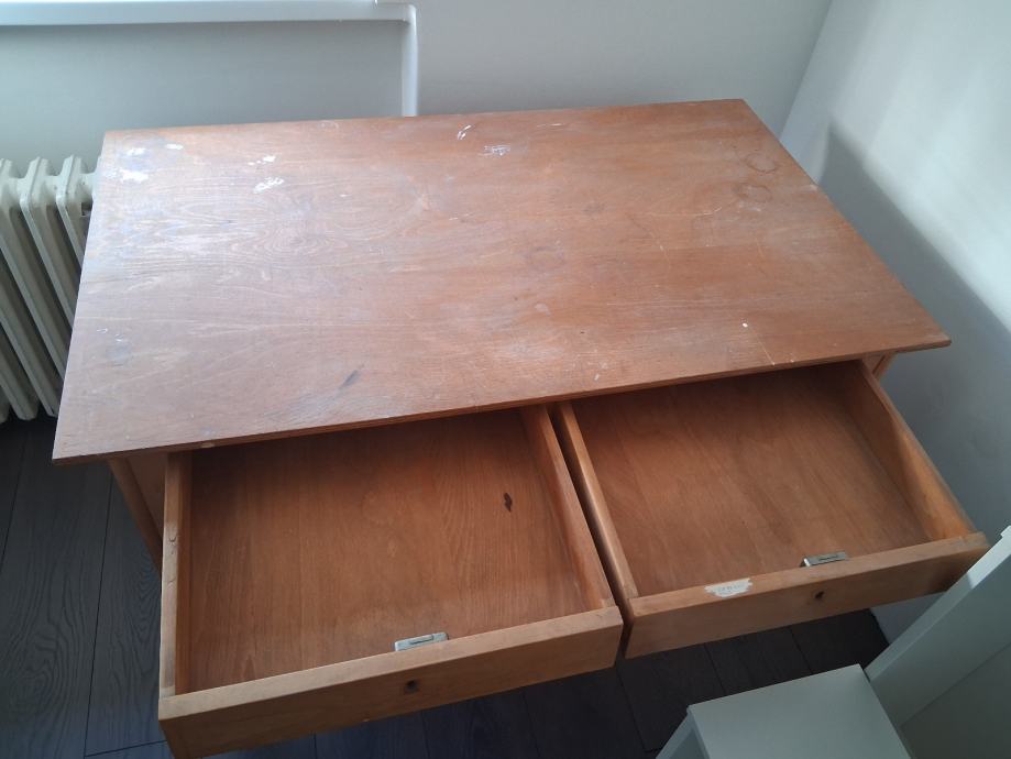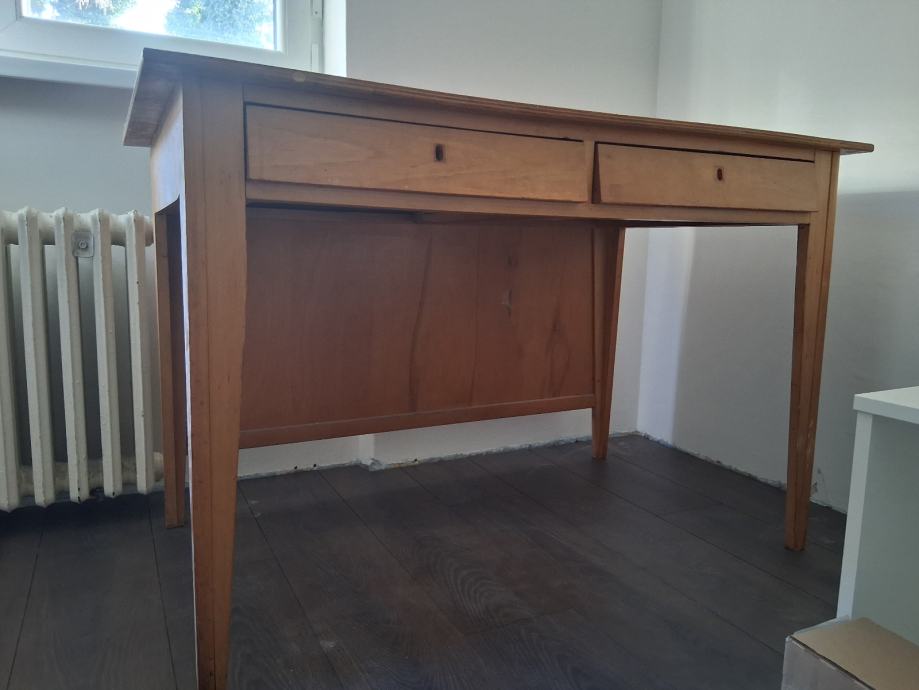 Radni stol koji je vjerojatno od punog drveta jer je poprilično težak. Jako se vide tragovi korištenja, ali dao bi se pobrusiti i prelakirati. Inače je dosta kvalitetan, čvrst i ne klima se. Ima 2 ladice.