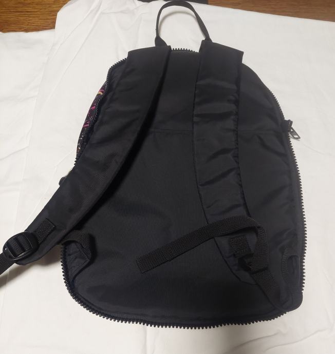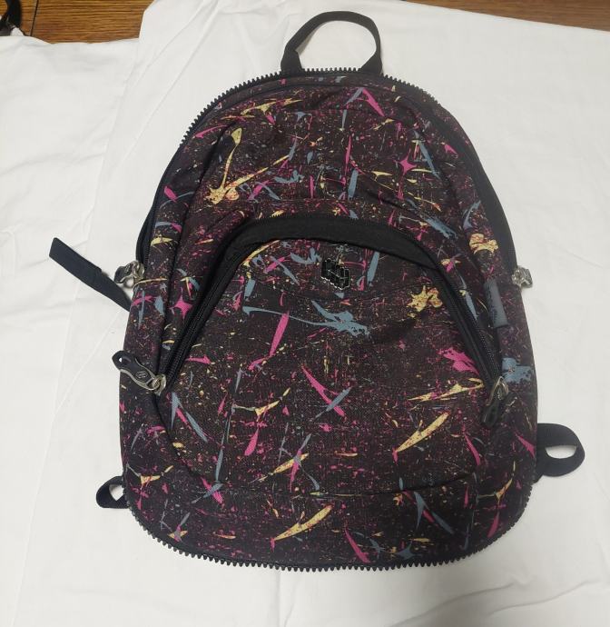 Poklanjam školski ruksak tamne boje s živopisnim šarenim uzorkom u obliku prskotina boje u nijansama ružičaste, žute, plave i sive. Prednja strana ima džep s patentnim zatvaračem, a sa strana su mrežasti džepovi. Leđna strana je u crnoj boji s podstavljenim naramenicama koje se mogu podešavati po duljini. Patent malog džepića je pokvaren.