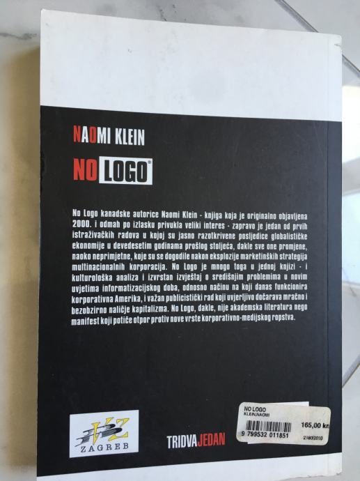 ”No Logo” je kulturološka analiza i izvrstan izvještaj o središnjim problemima u novim uvjetima informatizacijskog doba, odnosno načinu na koji funkcionira korporativna Amerika, i važan publicistički rad koji uvjerljivo dočarava mračno i bezoblično naličje kapitalizma.