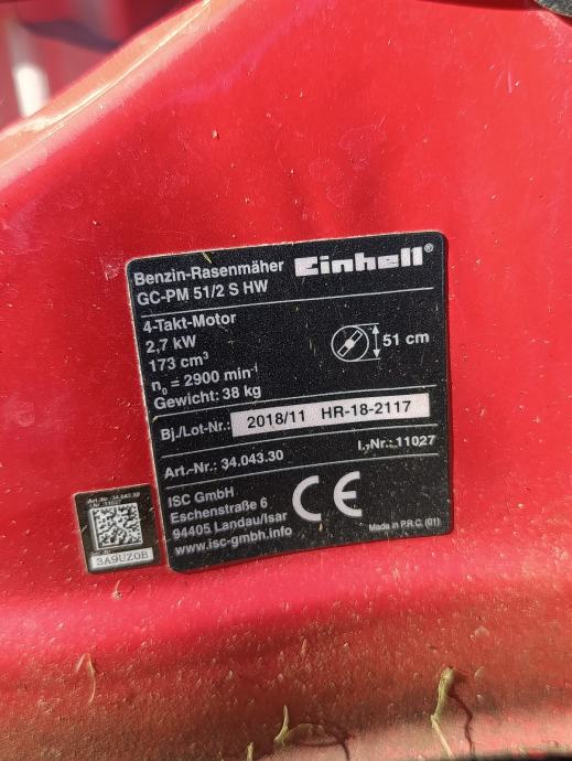 Prodajem motornu kosilicu Einhell GC-PM 51/2 S HW. Opremljena je četverotaktnim benzinskim motorom snage 2,7 kW i zapremnine 173 cm³, s brojem okretaja 2900 min⁻¹. Širina košnje iznosi 51 cm, a kosilica teži 38 kg.