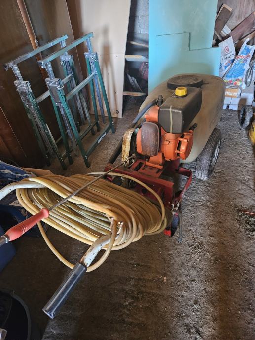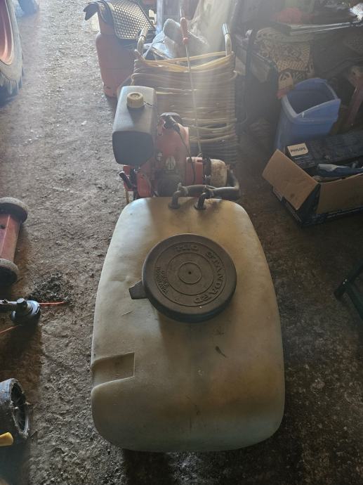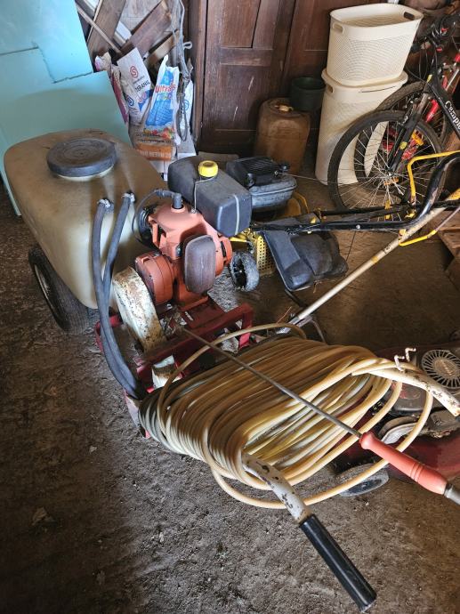 Prodajem motornu prskalicu na tačkama, pogodnu za prskanje voćnjaka, vinograda i ostalih površina. Uređaj je opremljen motorom, plastičnim spremnikom za tekućinu te crijevom za prskanje s ručkom. Montirana je na metalni okvir s kotačima što omogućuje lakše premještanje i manevriranje po terenu.