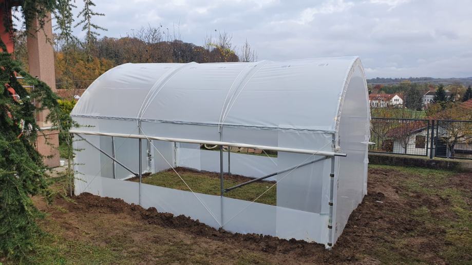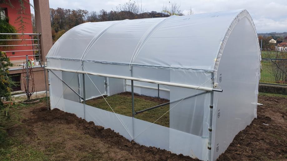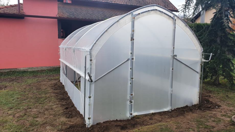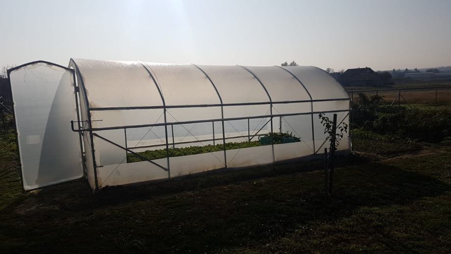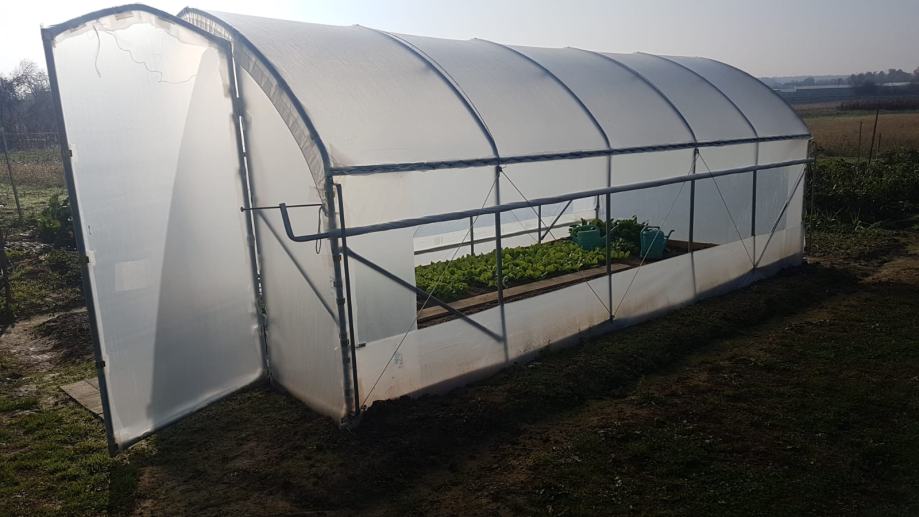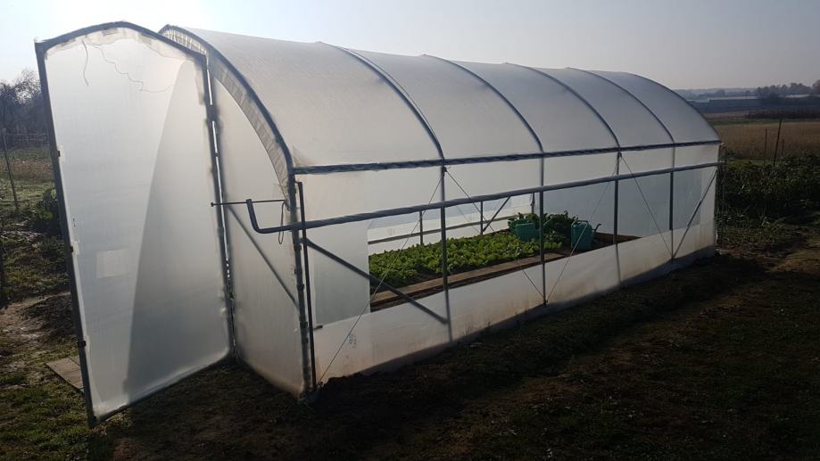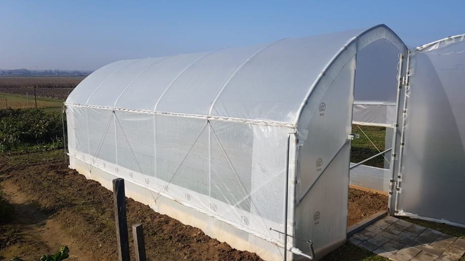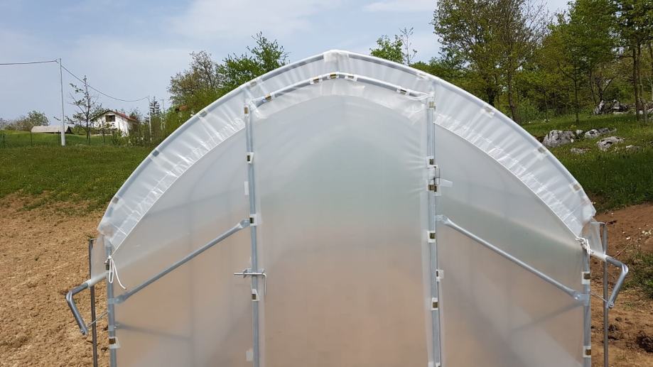 lukovi, stupovi, ankeri, ukrute, gornja vezna cijev, bočna lajsna za foliju, štokovi, 1x vrata, ukrute vrata, obujmice sa vijkom, žičane obujmice, kopče, FOLIJA Ginegar 180 mikrona ( folija je skrojena na rubovima i učvršćuje se sistemom zatezanja špage)., bočno provjetravanje sa oba dvije strane