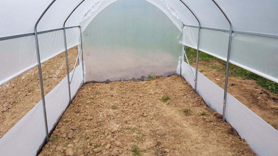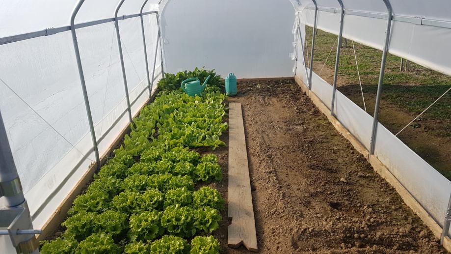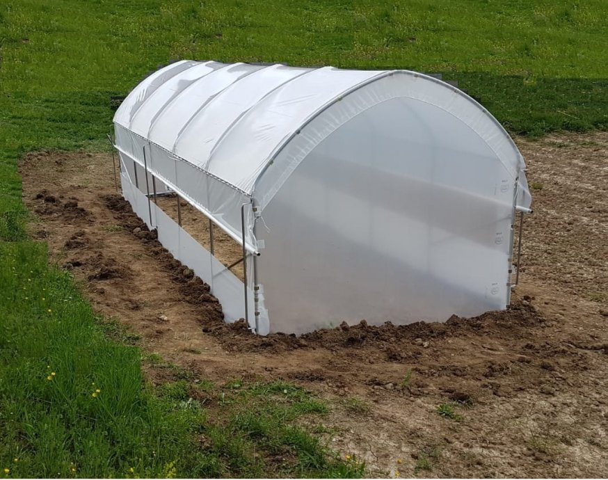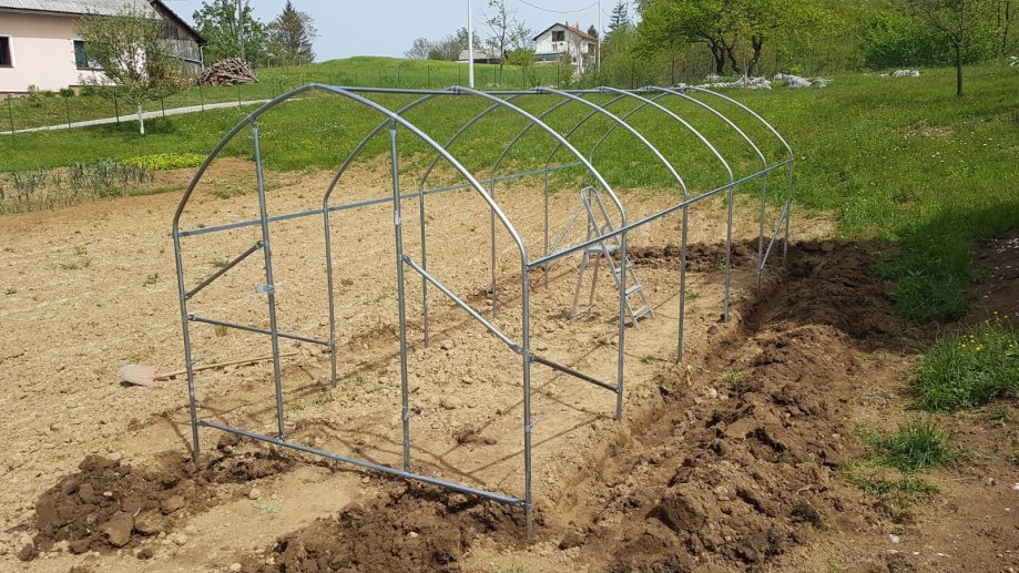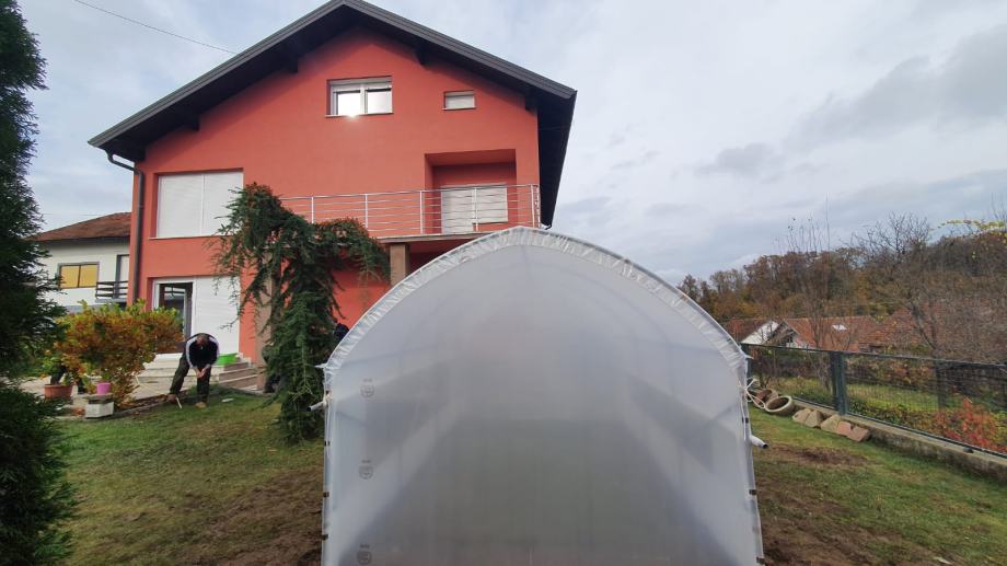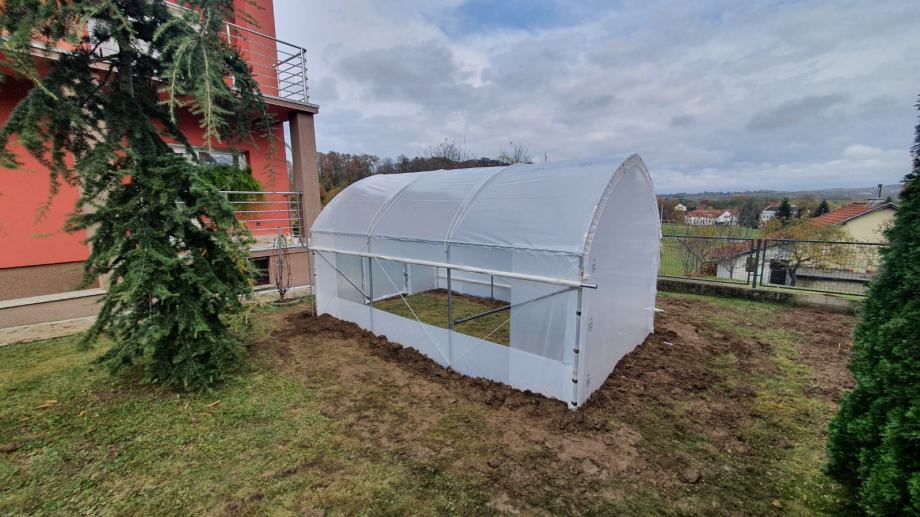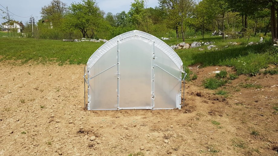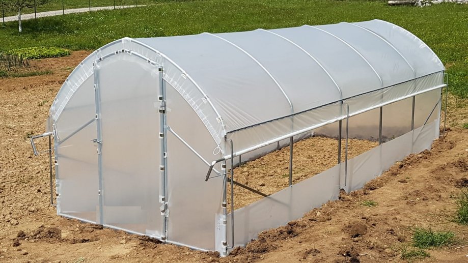 lukovi, stupovi, ankeri, ukrute, gornja vezna cijev, bočna lajsna za foliju, štokovi, 1x vrata, ukrute vrata, obujmice sa vijkom, žičane obujmice, kopče, FOLIJA Ginegar 180 mikrona ( folija je skrojena na rubovima i učvršćuje se sistemom zatezanja špage)., bočno provjetravanje sa oba dvije strane