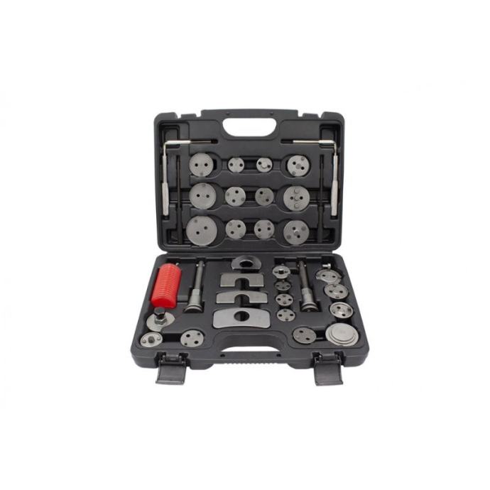 za ručno postavljanje kočionih klipova npr. prilikom zamjene kočionih pločicaprikladno za kočione čeljusti na stražnjoj prednjoj osovini, bez funkcije ručne kočnice (nije prikladno za modele s električnom ručnom kočnicom)alat za namotavanje s desnim i lijevim navojemprazan držač za mast za vreteno, za nesmetan rad s vretenima za resetiranje kočionog klipapločica za držanje, zatvorena, poluokruglazadržna ploča, zatvorena, okrugla s udubljenjemzadržna ploča, otvorena, pravokutnapločica za držanje, otvorena, poluokruglaIibijač Ø 3 & 5 mmključevi s unutarnjim šesterokutom 6 i 8 m24 adaptera za resetiranje kočionog klipa prikladna za većinu modela vozila, npr. g.: Alfa Romeo, Audi, BMW, Citroen, Fiat, Ford Australia, Europa, USA, General Motors (GM), Honda, Isuzu, Jaguar, Lancia, Mazda, Mercedes-Benz, MINI, Mitsubishi, Nissan, Opel, Peugeot , Proton, Renault, Rover, Saab, Seat, Subaru, Toyota, Volkswagen, VolvoSpecifikacije:A Desni repozicionerB Lijevi repozicionerC Imbus ključ 12 mmD Opći diskE Antena za BMW MiniF Disk za Jaguar tip SAdapteri:1 Alfa Romeo, Audi, Citroen, Fiat, Ford, Honda, Jaguar, Nissan, Peugeot, Renault Rover, Saab, Seat, Subaru, Volskwagen, Volvo2 Nissan, Peugeot, Renault, Rover, Saab, Subaru, Volkswagen, Volvo3 Ford, Lincoln, Subaru4 Nissan, Opel Astra G, Zafira5 Audi, Bmw, Citroen C5, Ford, Honda, Jaguar, Mitsubishi, Nissan, Peugeot, Rover Toyota, Volkswagen, Volvo6 Hyundai, Stilo, Kia7 Audi, BMW, Lancia, Proton, Renault, Rover, Volkswagen8 Audi A8-S89 Jaguar, Opel, Twr10 Citroen, Honda Prelud11 Ford (SAD)12 Citroen, Renault Alpine V6 (85-)13 Fiat14 Citroen C315 Citroen C516 Audi 80, 90, V8 + 100, Ford Sierra ABS + Scorpio ab 85, Honda prelude, Nissan Silvia 1.8 Turbo, Rover 8000, Saab 9000, Subaru L+Z, VW Golf - Passat17 Peugeot 20618 Nissan Primera19 Fiat Stilo20 Renault Modus21 BMW Mini22 Renault Clio23 Jagura tip S]]>