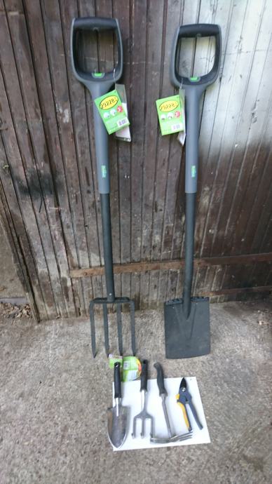 Set ručnog alata za vrt, lopata i vile sa podesivom ručkom, škare za grane, mala lopatica, grabljice i alat za rahljenje zemlje.