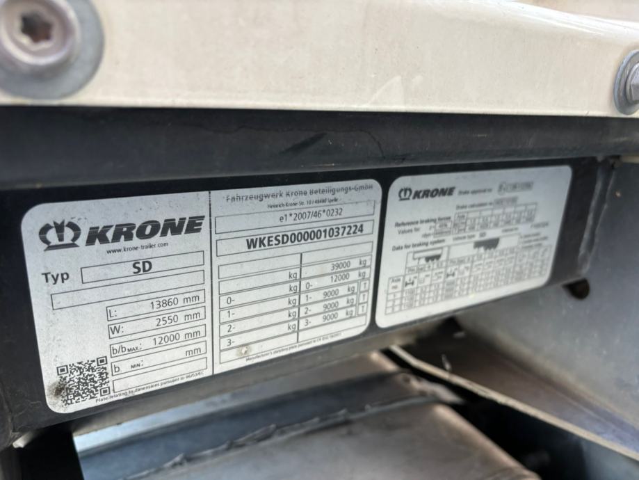 KRONE SD mega, u prometu od 11/2022, ABS, EBS, zračni ovjes, podizna osovina, podizni krov, kutija za alat, rezervni kotač, dimenzije vozila DxŠxV: 13.860 mm x 2.600 mm x 4.000 mm, NDM: 36.000 kg, masa praznog vozila: 6.748 kg, nosivost: 29.252 kg, gume: 435/50 R19,5, VIN: WKESD000001037224