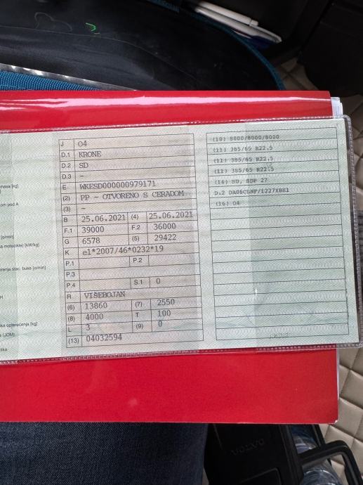 KRONE SD,u prometu od 06/2021, ABS, EBS, zračni ovjes, disk kočnice, podizna osovina, alu vrata, paletar za 32 palete,kutija za alat, dimenzije vozila DxŠxV: 13.860 mm x 2.550 mm x 4.000 mm, NDM 36.000 kg. masa praznog vozila: 6.578 kg, nosivost: 29.200 kg, gume: 385/65R22,5,