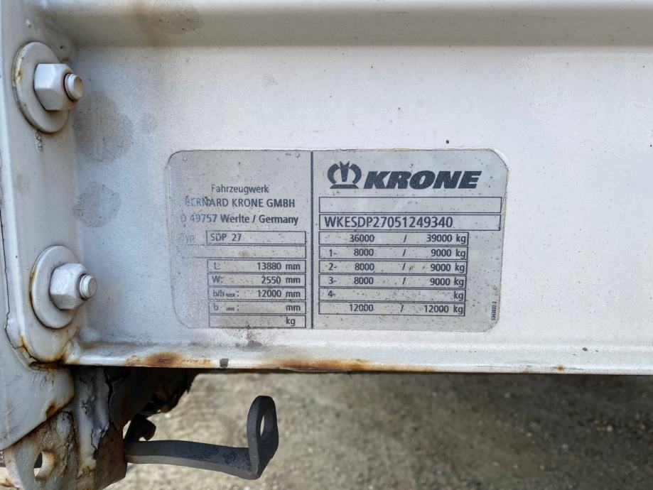 Krone SDP 27 mega, u prometu od 09/2005, ABS, EBS, zračni ovjes, disk kočnice, SAF osovine, NDM 36.000 kg, masa praznog vozila: 7.050 kg, nosivost: 28.950 kg, gume 455/40 R22,5. VIN: WKESDP27051249340