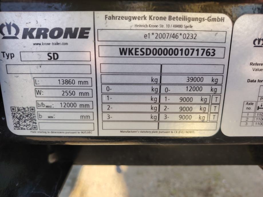 KRONE SDP 27, u prometu od 03/2024, ABS, EBS, zračni ovjes, disk kočnice, podizna osovina, podizni krov, kutija za alat, dimenzije vozila DxŠxV: 13.860 mm x 2.550 mm x 4.000 mm, NDM 36.000 kg. masa praznog vozila: 6.800 kg, nosivost: 29.200 kg, gume: 385/55 R22,5, VIN: WKESD000001071763