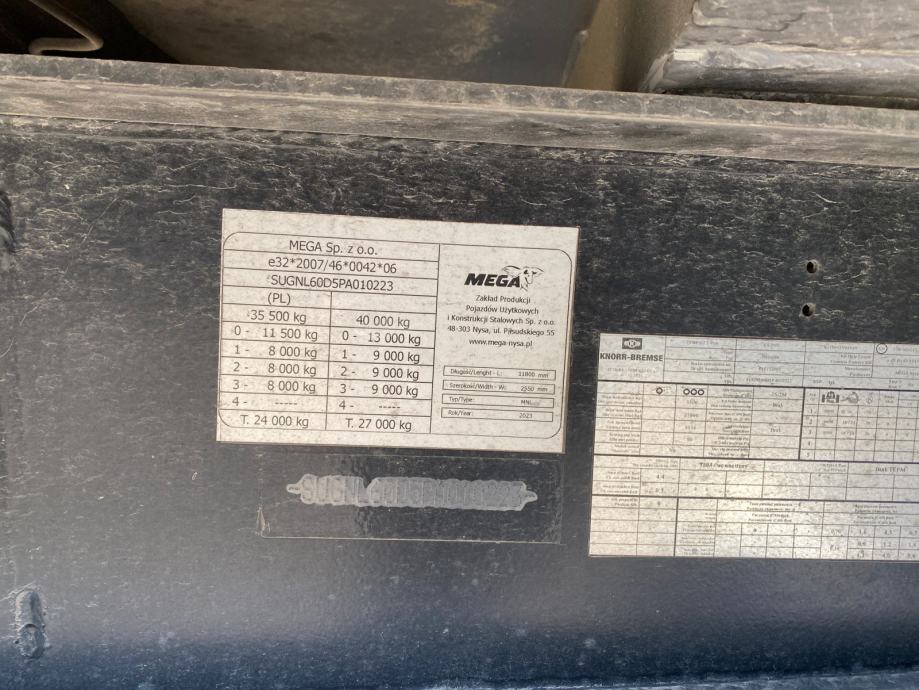 MEGA LIGHT alu kiperica 60m³, u prometu od 11/2023, ABS, EBS, zračni ovjes, SAF osovine, podizna osovina, stražnja portalna vrata, rolo pokrivna cerada, sanduk za alat, dimenzije vozila DxŠxV: 11.800 mm x 2.550 mm x 3.960 mm, NDM 40.000 kg, masa praznog vozila 6.480 kg, nosivost 33.500 kg, visina kopčanja 1.150 mm, gume 385/65 R22,5, VIN: SUGNL60D5PA010223