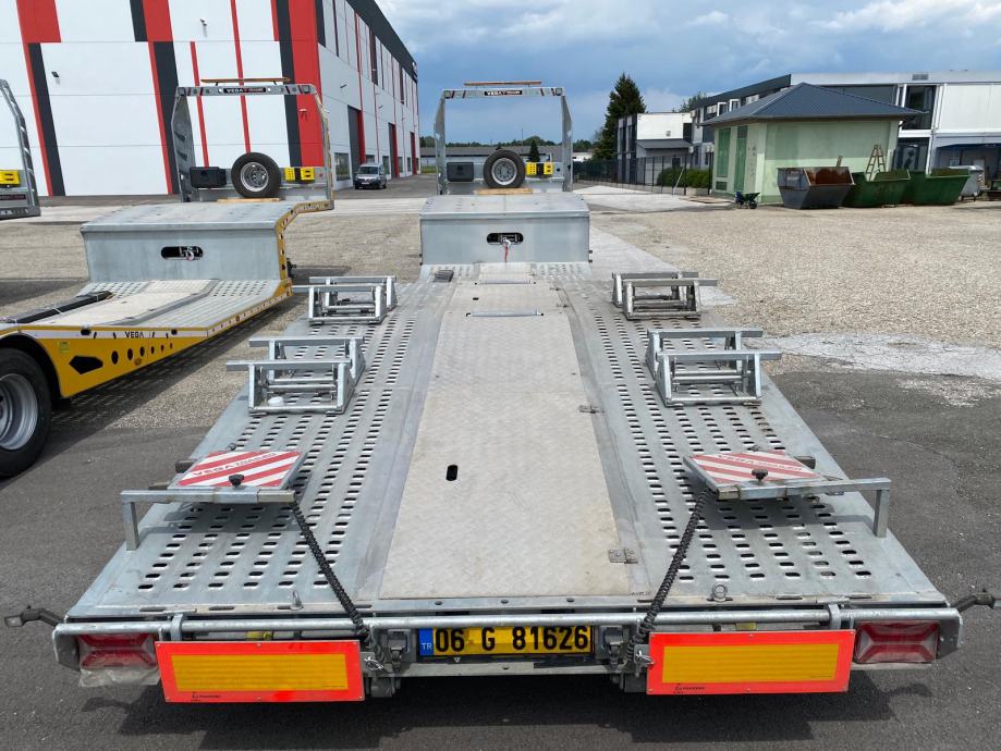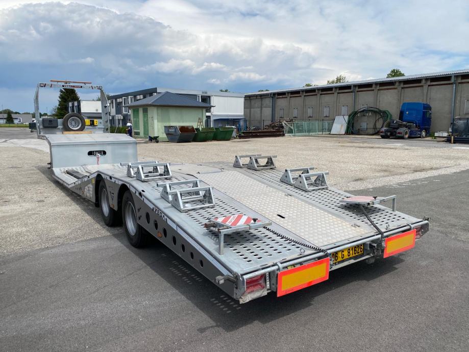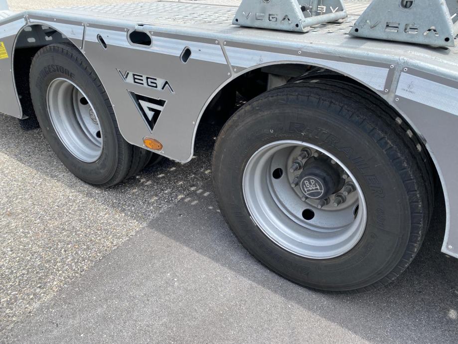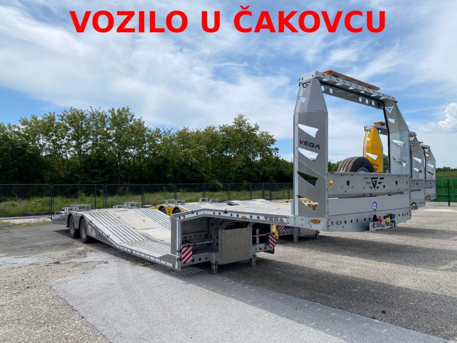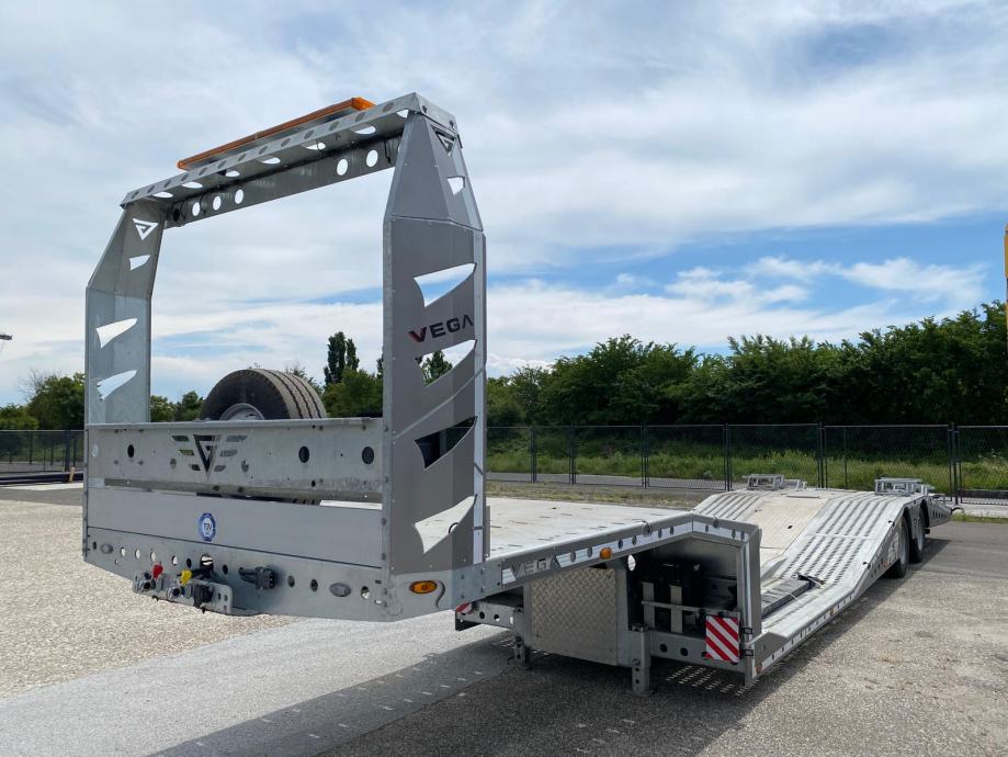 VEGA TRAILER ARLA VG-235, 2 osovinska labudica za prijevoz kamiona, NOVO VOZILO (2025 god.), pocinčana karoserija, Wabco EBS, BPW osovine, zakretna 2. osovina, doboš kočnice, zračni ovjes, električni sistem Aspock, dimenzije vozila DxŠ: 13.300 mm x 2.550 mm, NDM: 38.000 kg, masa praznog vozila: 6.930 kg, gume: 245/70 R17.5, rezervni kotač, električno vitlo nosivosti 8.000 kg, mini daljinski upravljač, ručne rampe straga. VIN: NR9VEGA25AS257276