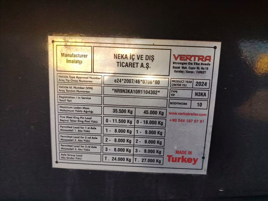 VERTRA TRAILER N3KA10 - kiperica za željezni otpad 64 m³, u prometu od 02/2024, WABCO ABS kočioni sistem, disk kočnice, zračni ovjes, SAF osovine, podizna 1. i 2. osovina, pokrivna cerada, kutija za alat, SABA LED svjetla 2x7 pin konektori, 2 potporne noge dinamičkog kapaciteta 25 t (statički 50t), hidraulički cilindar 250 bar (5 stupanjski), pod - Hardox TUF500 (4 mm), bočno - Hardox TUF500 (3 mm), NDM 35.500 kg (45.000 kg), masa praznog vozila 9.500 kg, gume 385/65 R22,5.