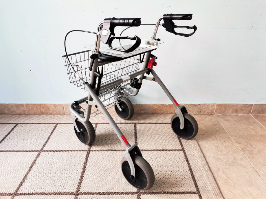 Konstrukcija rolatora u svijetlosivoj boji postavljena je na četiri kotača (200x50mm) čije su gume izrađene od visokokvalitetnog poliuretana bez zračnice, otporne na probijanje. Prednji kotači mogu se okretati za 360°, dok su stražnji kotači u fiksnoj ravnoj poziciji. Na upravljačkim drškama postavljene su dvije kočnice s zaobljenim krajem. Kada se kočnice pritisnu prema dolje, aktivira se funkcija parkirne kočnice, odnosno blokada stražnjih kotača. Na kabelima kočnica nalazi se kromirani šestougaoni nastavak pomoću kojeg se regulira snaga kočenja prema visini upravljačkih drški.