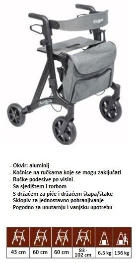 Za unutarnju i vanjsku uporabu. Torba je uključena uz rolator kao i držač za piće i držač za štap/štaku (štap ili štaka se prodaje odvojeno).