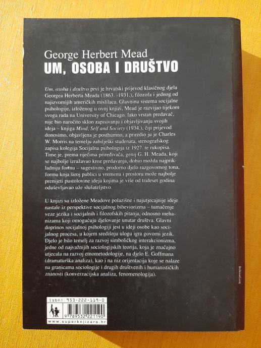 Sa stajališta socijalnog biheviorista. Priredio i uvod napisao Charles W. Morris. Preveo Srđan Dvornik. Um, osoba i društvo prvi je hrvatski prijevod klasičnog djela Georgea Herberta Meada (1863. -1931.), filozofa i jednog od najizvornijih američkih mislilaca. Glavninu sistema socijalne psihologije, izloženog u ovoj knjiz,i, Mead je razvijao tijekom svoga rada na University of Chicago. Iako vrstan predavač, nije bio naročito sklon zapisivanju i objavljivanju svojih ideja – knjiga Mind, Self and Society (1934.), čiji prijevod donosimo, objavljena je posthumno, a priredio ju je Charles W. Morris na temelju zabilješki studenata, stenografskog zapisa kolegija Socijalna psihologija iz 1927. te rukopisa.