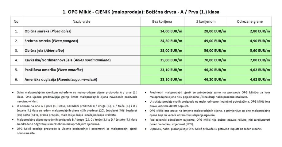 - Maloprodajni cjenik božićnih drvaca i odrezanih grana istih je priložen kao fotografija.