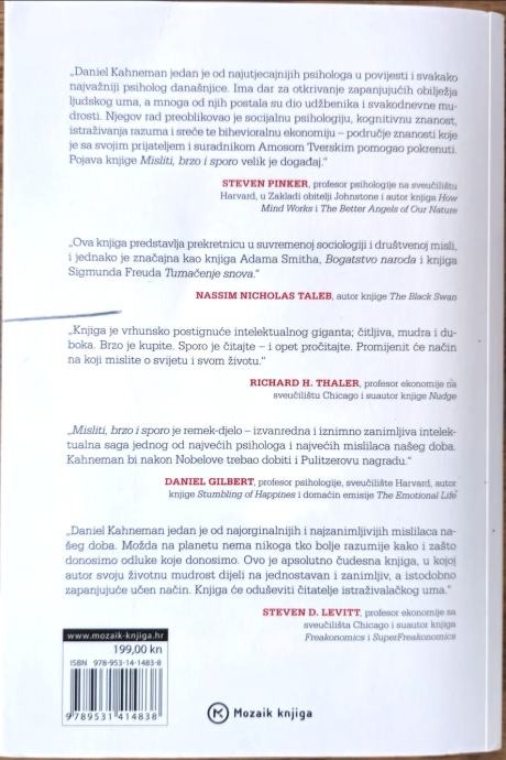 Misliti brzo i sporo je monumentalno djelo slavnog nobelovca i jednog od najznačajnijih svjetskih psihologa. Dobitnik Nobelove nagrade za ekonomiju, Daniel Kahneman u svom je inovativnom radu na području psihologije proučavao racionalan model prosuđivanja i donošenja odluka. Jedan je od najznačajnijih mislioca današnjice čije su ideje i dostignuće utjecale na mnoga područja ljudskog djelovanja – korporativno poslovanje, medicinu i politiku. Sve do ove knjige, nije na jednom mjestu sažeo svoja istraživanja i promišljanja.