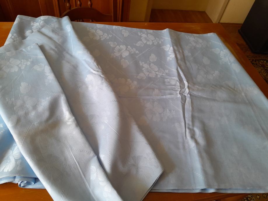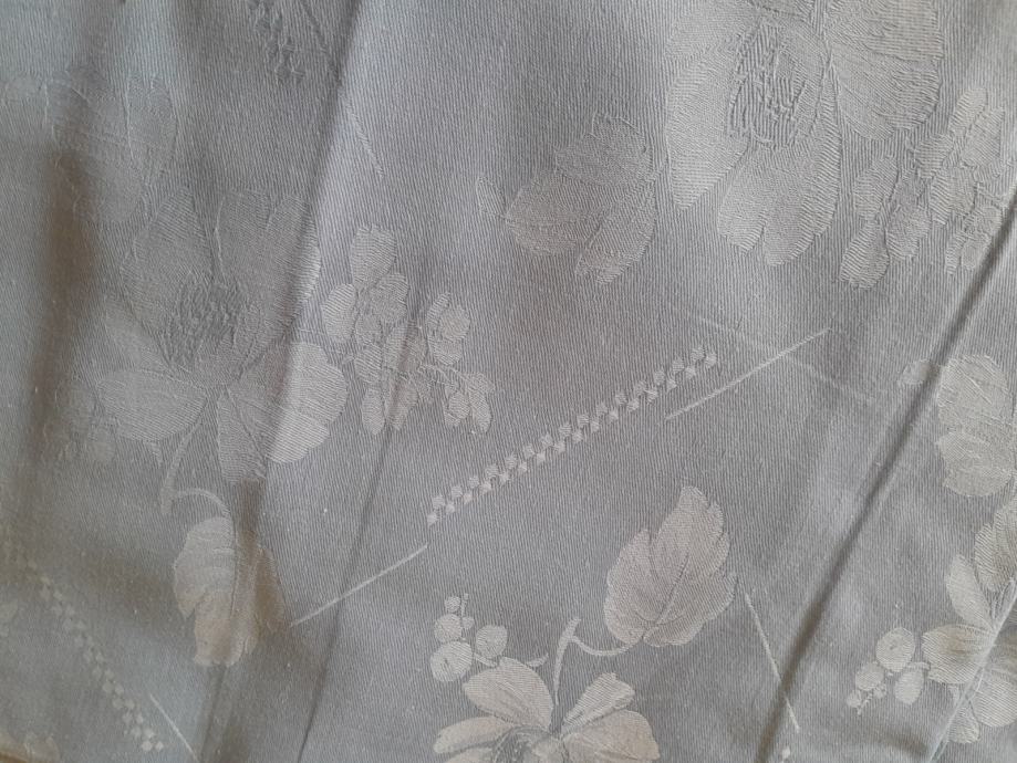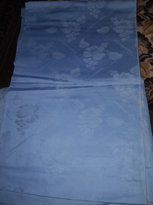 Kvalitetan damast bijeli i plavi s diskretnim cvjetnim uzorcima i prugama .