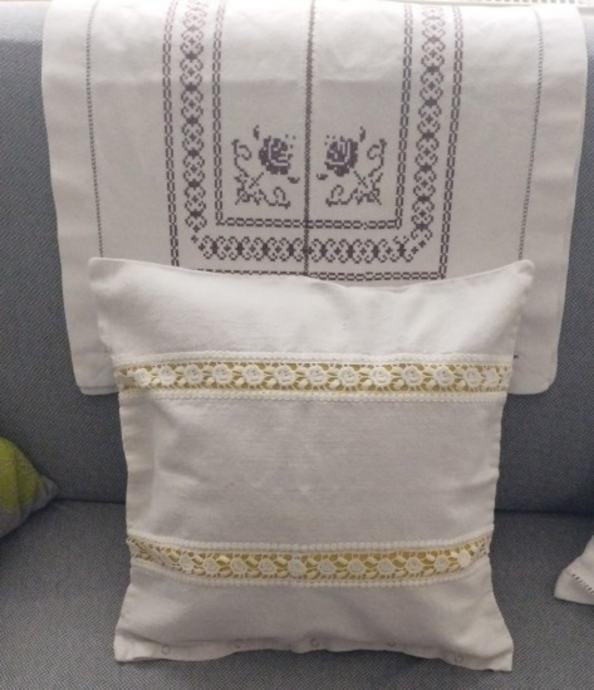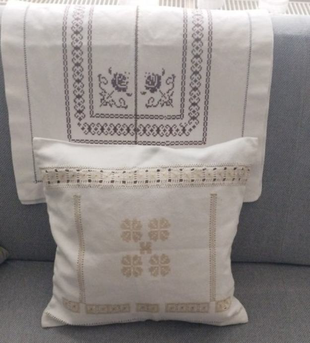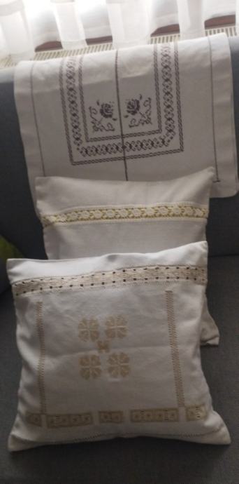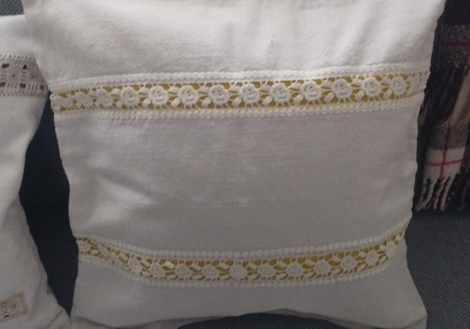Jedan jastučić domaće tkano laneno platno i čipka, drugi pamuk friško navezeno.