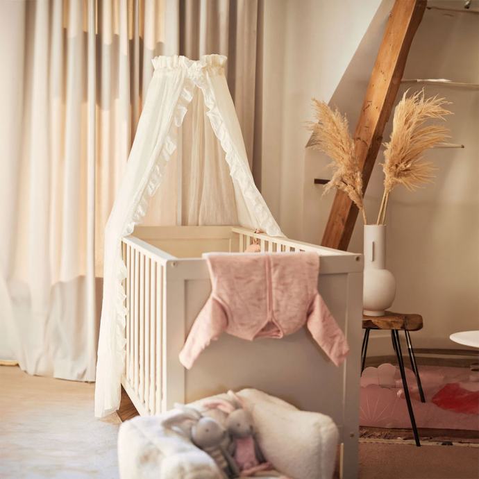 S ovim baldahinom u vintage stilu s volanima, možete pretvoriti bebin krevetić u udoban prostor za spavanje. Baldahin pruža ugodnu atmosferu i osjećaj sigurnosti. S odgovarajućim nosačem, baldahin možete lako postaviti bez potrebe za bušenjem rupa u stropu ili zidu. Zahvaljujući nosaču s prstenom, baldahin će biti postavljen u tren oka. Nosač ne dolazi s baldahinom, ali se može kupiti zasebno na poveznici.