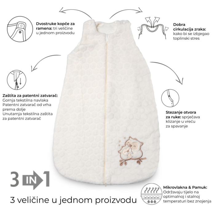 Kenguru Gold vreća za spavanje štiti i grije tijelo dojenčadi tijekom cijele noći. Pamučna tkanina pruža mekan osjećaj. U jednom proizvodu dobijete tri veličine. Podesiva je veličina vrata i ramena.