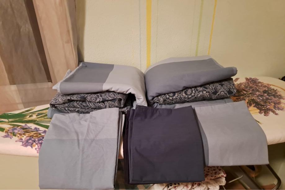 Prodajem u kompletu popluni, jastuci, posteljina i plahte na gumicu. Sve za 2 bračna kreveta sa dodatnim jastucima i izmjenom posteljine… idealno za apartman.