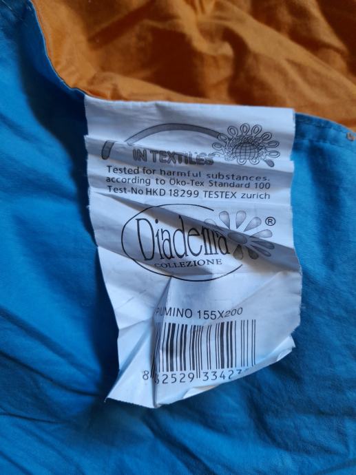 Novi pernati poplun "Diadema" od gušćih pahuljica pamučni inlet jednobojni, jedna strana naranđasta a druga plava 155x200 cm. Sačuvan u vreći bez pristupa zraka.
