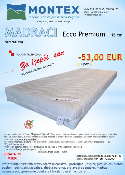 Cijena madraca Ecco Premium 16 cm - 53,00 eur ( bez PDV-a) - 66,25 eur sa PDV-om